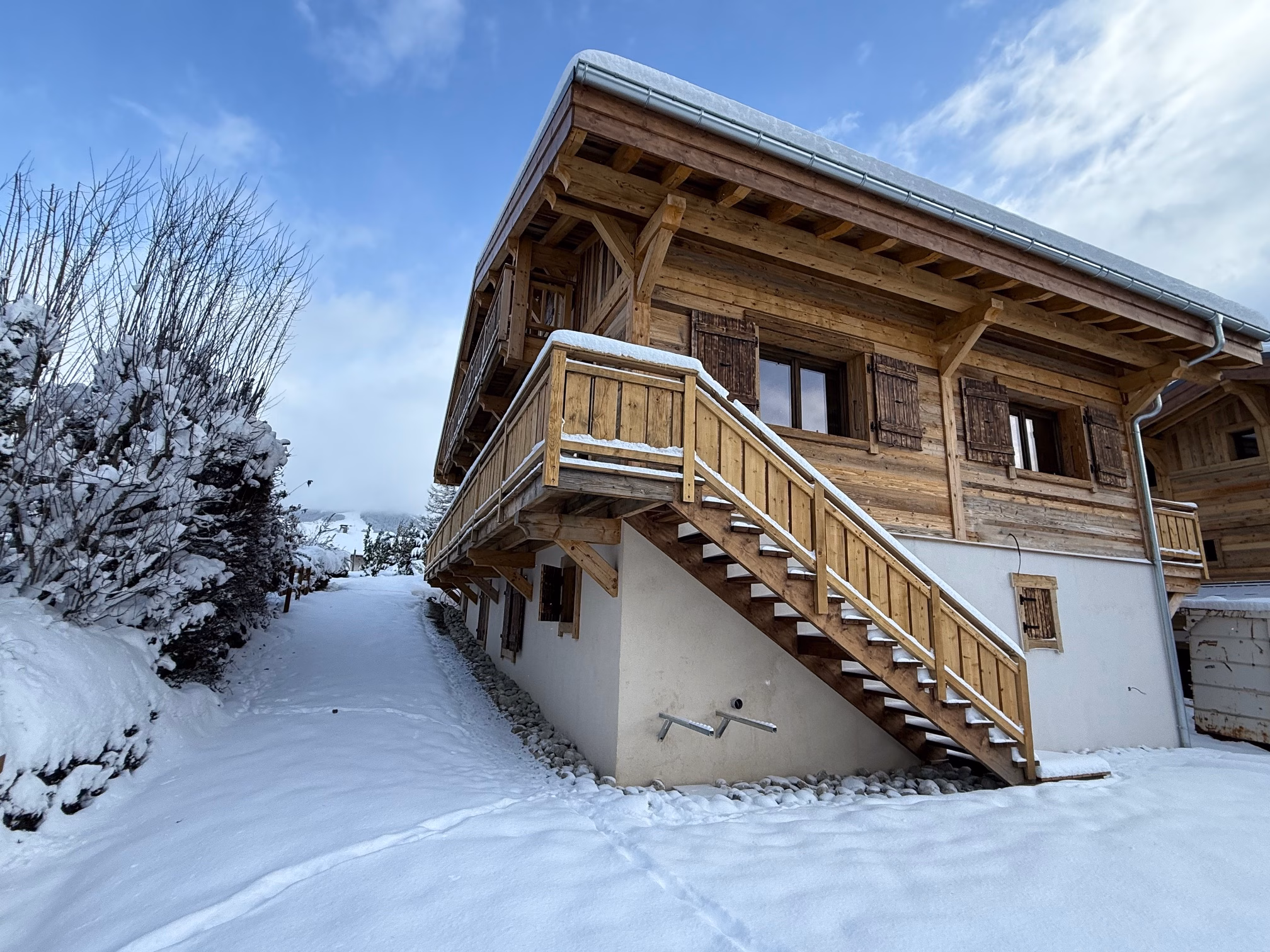 - 30 cm raft foundation, followed by formwork and a 20 cm-thick concrete slab (load-bearing walls over 3 levels for each half-chalet).
